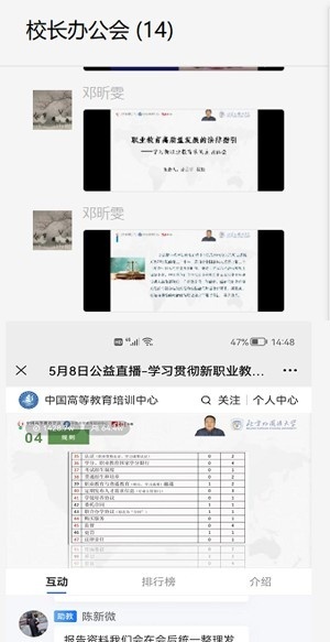 2022年5月8日,在职教宣传周的天,北京市外事学校组织干部、骨干教师收看由中国高等教育学会、中国高等教育培训中心主办的线上公益直播《学习贯彻新职业教育法宣讲大会》。在学校校长田雅莉、书记任保东带领下,全体干部、各级各类骨干教师、学校青蓝计划培养团队成员共60余人积极参加大会学习。通过一天的学习,大家聆听了杜玉波、陈子季、王大泉、周建松、孙善学、和震六位领导、职教专家和学者的精彩解读,进一步学习了新职业教育法的内涵与意义,了解了新职业教育法的修订策略,对现代职业教育发展面临的新形势、新要求,深化依法治教、依法办学、促进职业院校治理体系和治理能力现代化,深化产教整合、校企合作、完善职业教育保障制度和措施以及技能型社会与职业教育改革展望等有了更深的理解。